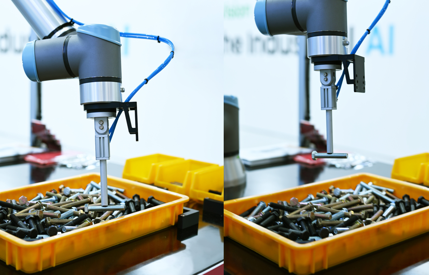 적재함에 불규칙하게 쌓인 볼트를 볼트러너의 카트리지에 신속하게 투입하기 위해, 한 번의 촬영으로 여러 볼트의 자세를 감지하여 최대 3개의 볼트를 동시에 피킹할 수 있습니다. 또한, 피킹 과정에서 볼트 산의 무너짐이나 위치 변화를 최소화하도록, 사용자 지정 우선순위 기반의 빈 피킹(Bin Picking) 기술을 제공합니다.