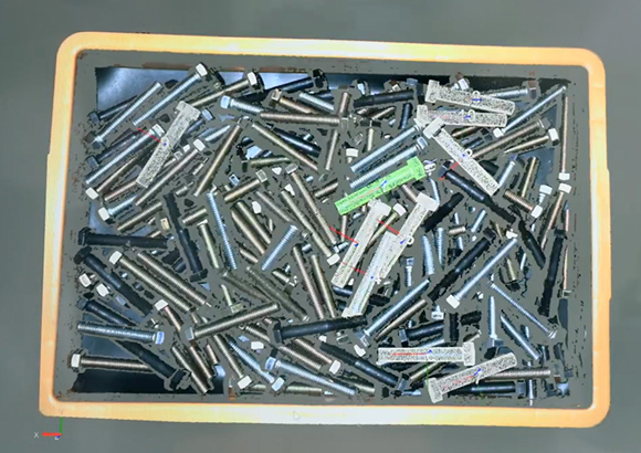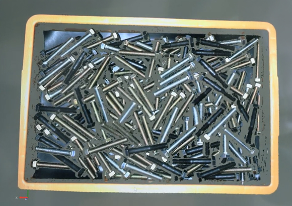 무질서하게 혼재된 3종의 볼트를 CoPick3D 비전 카메라로 정밀 스캔합니다. 복잡하게 쌓여있는 환경에서도 각 객체의 위치와 자세 데이터를 정확하게 추출합니다.